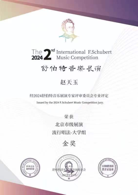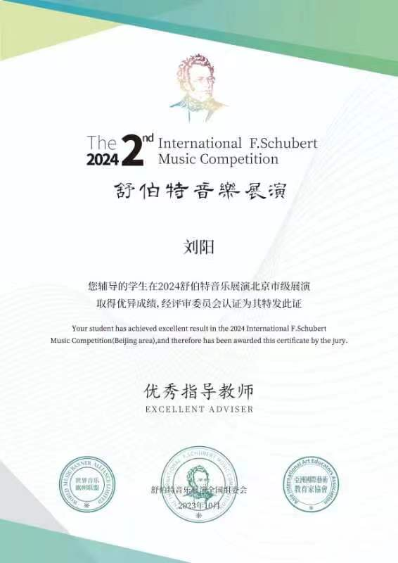 舒伯特音乐展演(The International F·Schubert Music Competition)为弘扬F·舒伯特在音乐创作和艺术教育领域的成就,由世界音乐旗帜联盟发起举办,亚洲国际艺术教育家协会协办,面向世界各地青少年音乐家、音乐爱好者开放报名。大赛组委会由艺术领域中极具权威性和经验丰富的专家们组成,赛事举办以来吸引了全球的音乐爱好者、专业演奏家及团队参加比赛。学前教育专业刘阳老师指导学前22级、23级学生将专业技能与展演比赛相结合,经过刻苦训练最终取得优异成绩。