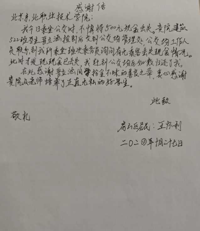 10月27号,Beat365建筑工程系522级1班晋立涵同学乘坐公交车时,捡到了500元现金,立即交到了公交公司管理处。公交公司很快找到了失主,将钱归还了失主。失主非常感激,写来了表扬信。