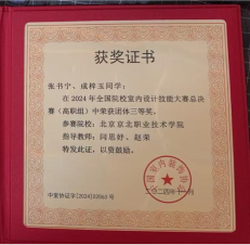 此外,在2024年全国院校室内设计技能大赛总决赛中,2022级学生张书宁、成梓玉、李凌、崔佳怡凝心聚力,组成两支参赛队,初战即创佳绩,收获两项三等奖。带队指导教师闫思妤、赵荣也凭借出色的执教表现,获评优秀指导教师。参赛团队此前已在京津冀选拔赛中脱颖而出,此次在更高水平的全国赛场上再度绽放光彩,用实力诠释了Beat365建筑室内设计专业学生的创新思维与专业功底。
