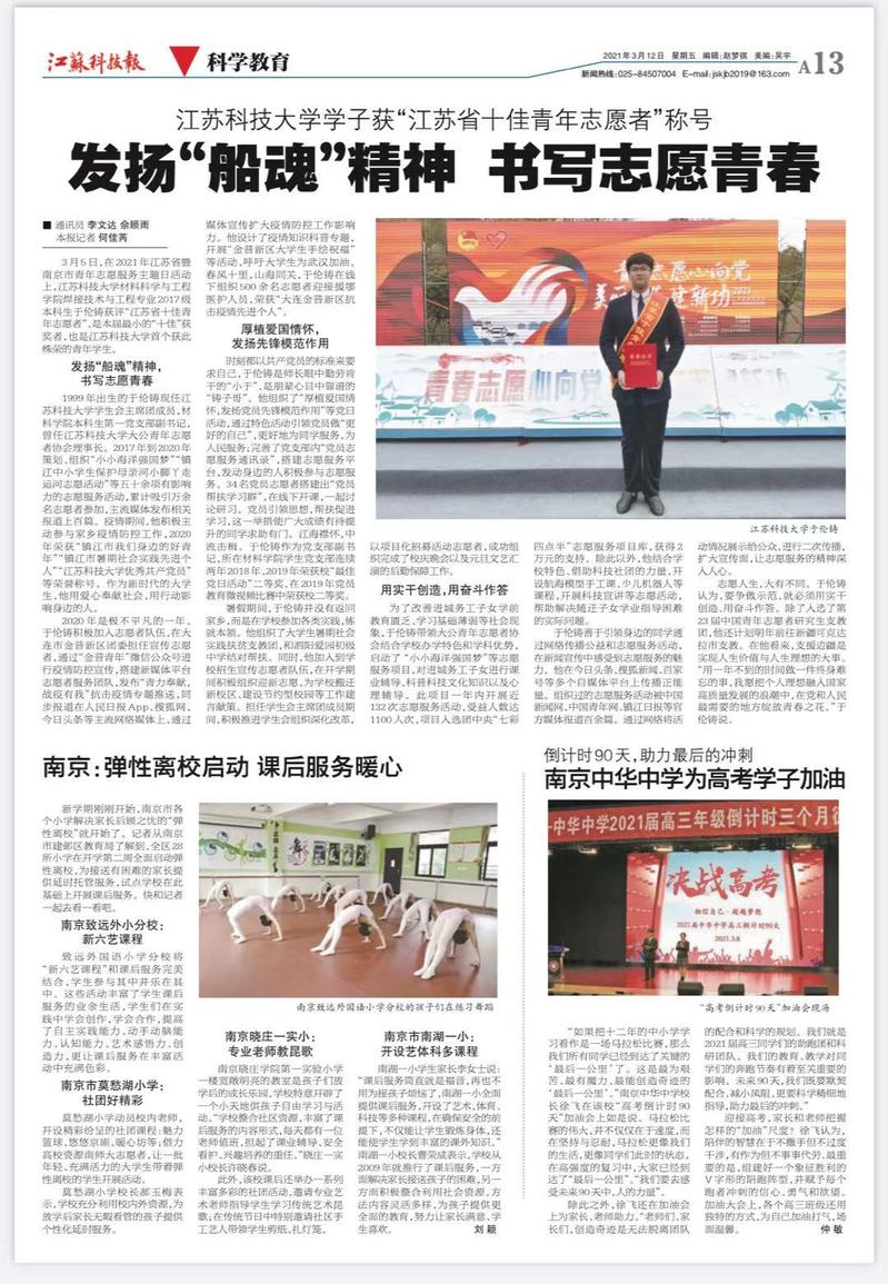 在3月5日2021年江苏省暨南京市青年志愿服务主题日活动上,必赢bwin官网入口材料科学与工程学院焊接技术与工程专业2017级本科生于伦铸获评“江苏省十佳青年志愿者”,是本届“最小”的“十佳”获奖者,也是必赢bwin官网入口首位获此殊荣的青年学生。本次活动由共青团江苏省委、江苏省文明办、江苏省民政厅、江苏省志愿者协会主办,共青团南京市委等单位承办。活动现场表彰了2020年度省十佳青年志愿者和十佳青年志愿服务项目团队等。“十佳青年志愿者”评选分为初选推报、专家复评、候选答辩、综合评定等环节,于伦铸同学从全省264名“优秀青年志愿者”中脱颖而出,经过20强候选答辩后,最终成功当选“十佳”。