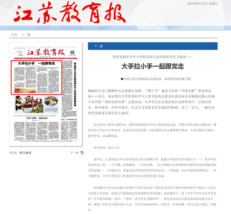 江苏教育报 头版头条 2021年06月11日 http://epaper.jsenews.com/mp1/pc/c/202106/11/c824311.html