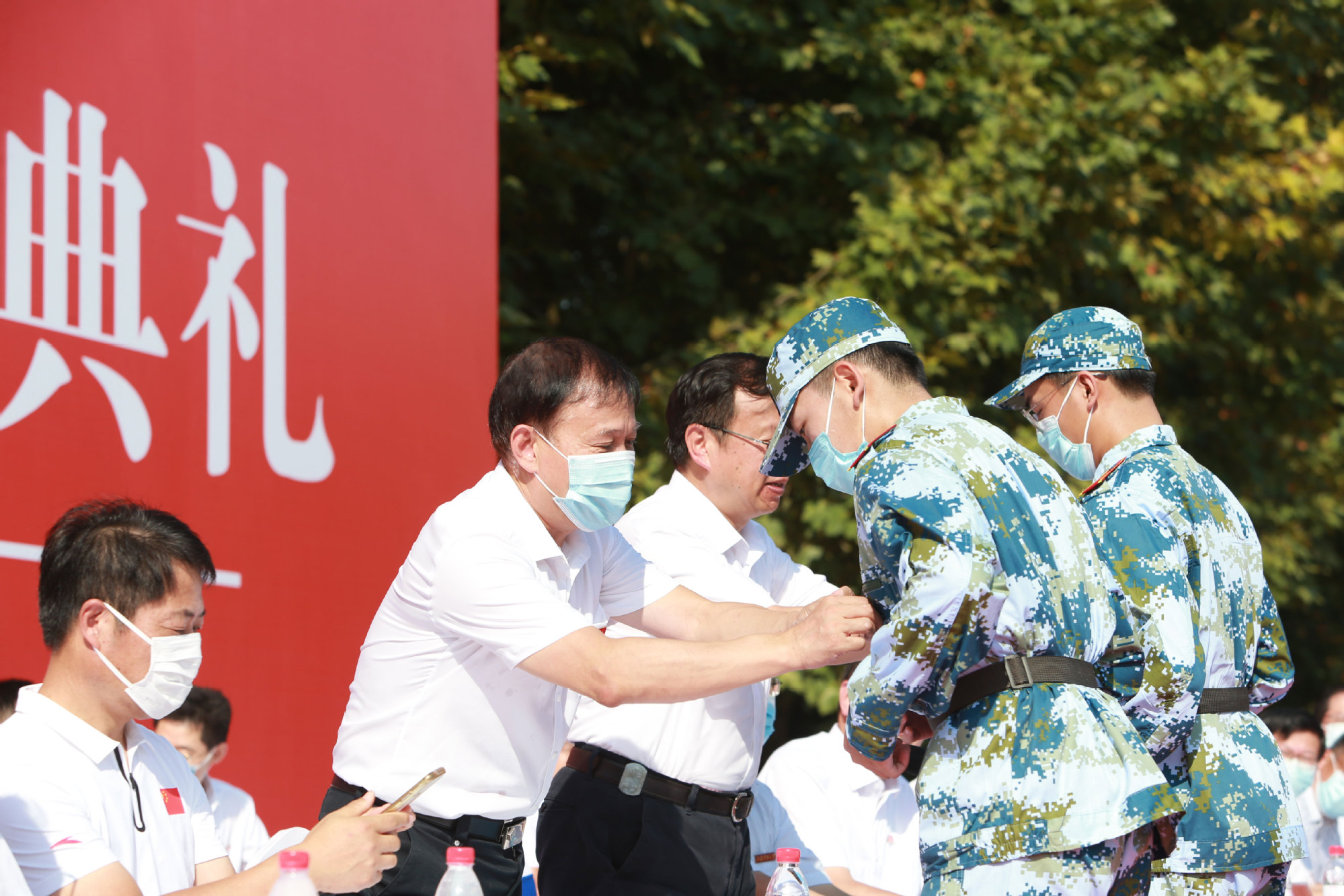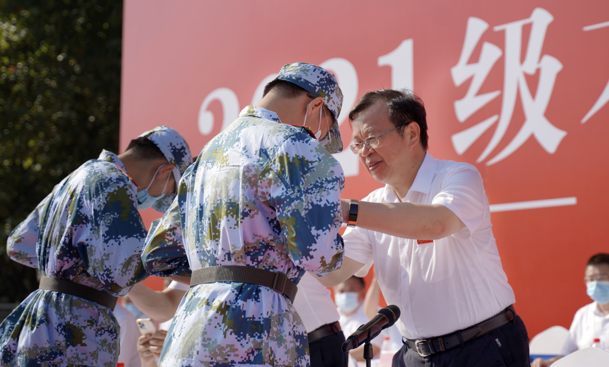 在全场热切瞩目中,葛世伦书记、周南平校长为2021级本科生代表张子为、陈昭宇两位同学颁授校徽。一枚校徽,一场联接,从此以后,2021级新生就和江科大结成了紧密相关的命运共同体。