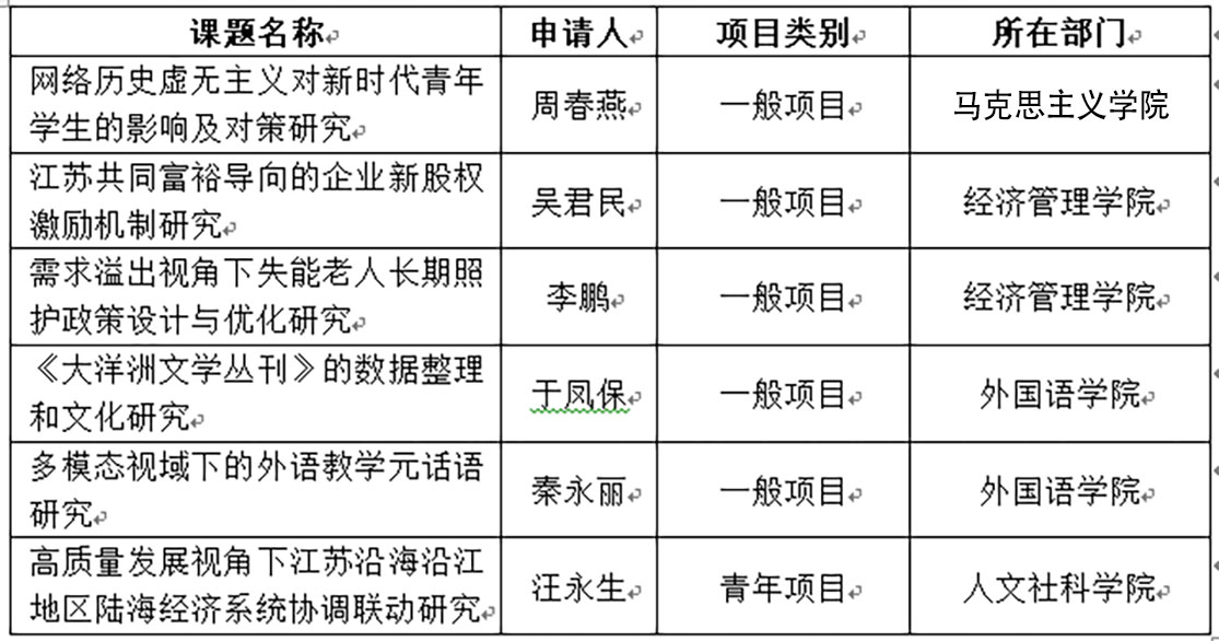 日前,江苏省哲学社会科学规划办公室公布了2021年度省社科基金立项项目名单,必赢官网共6项课题获批年度项目立项(不包括自筹项目),其中,一般项目5项、青年项目1项。立项名单如下: