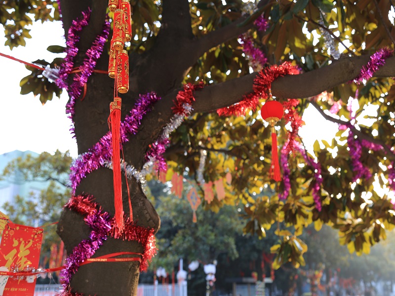 “一棵树一支部”,深蓝学院135个团支部以支部组队,每队认领勤奋路两旁的一棵树,对其进行装饰。各班同学集思广益,将自己的奇思妙想幻化作枝丫上五彩缤纷的气球和霓虹灯,年味儿应运而生。同学们积极写下了属于自己的、独一无二的新年祈福语并将其悬挂在了各班的祈福树上,小到个人、大到国家和世界,一字一句都寄予了对新年最美好的希望和憧憬。与此同时,团支书大类负责人还组织起了“跳蚤市场·元旦年会”,在相关摊位进行物品的售卖,整个校园被绚丽多彩的祈福树和摆满了琳琅满目物品的摊位装点得极具中国特色烟火气。