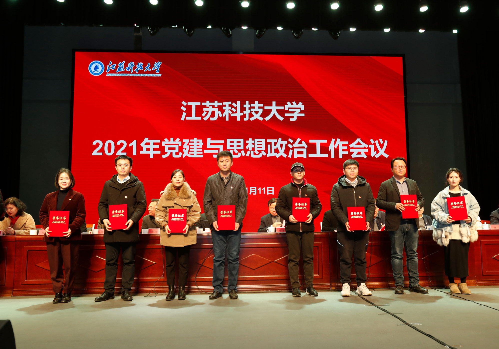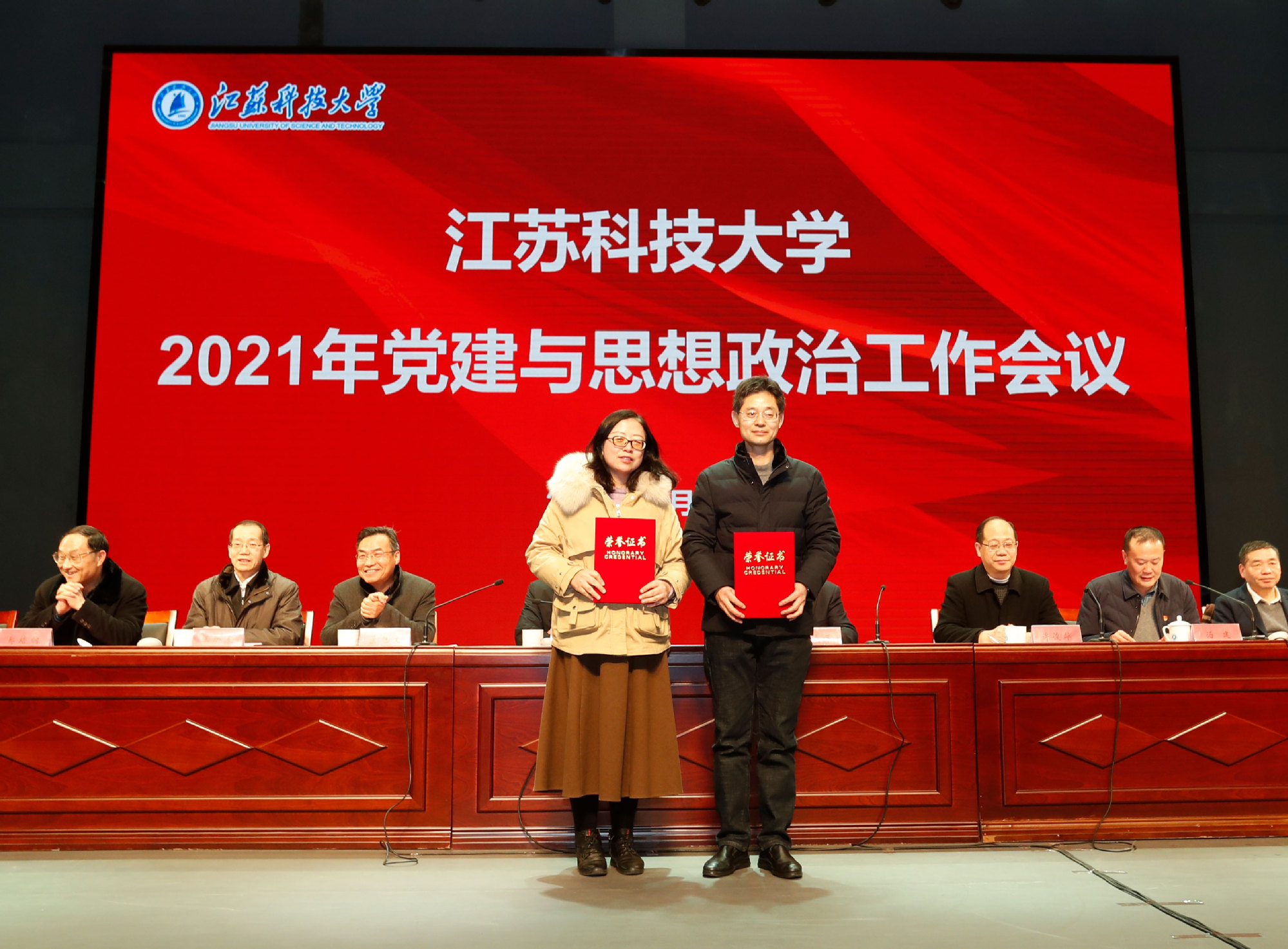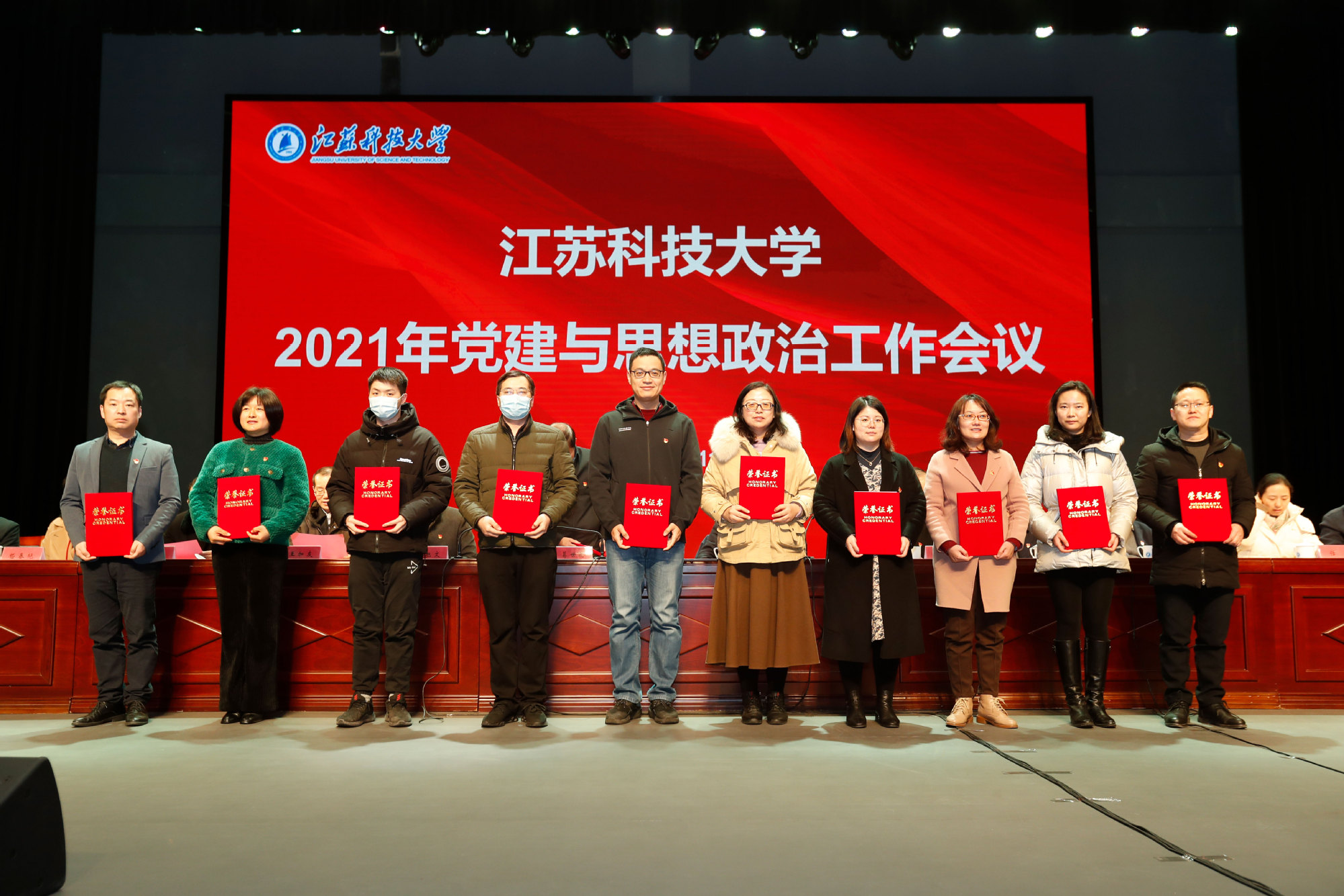 党委副书记、副校长景旭文宣读《关于表彰2021年度党建与思想政治工作先进个人的决定》;党委副书记许俊华宣读《关于表彰2021年度党建与思想政治工作优秀论文的通知》。20位先进个人和12篇优秀论文作者受到表彰,主席台领导为获奖者颁奖。