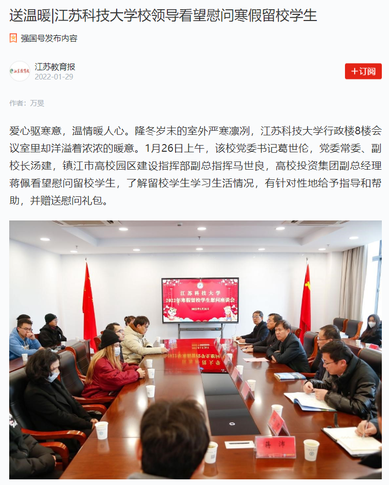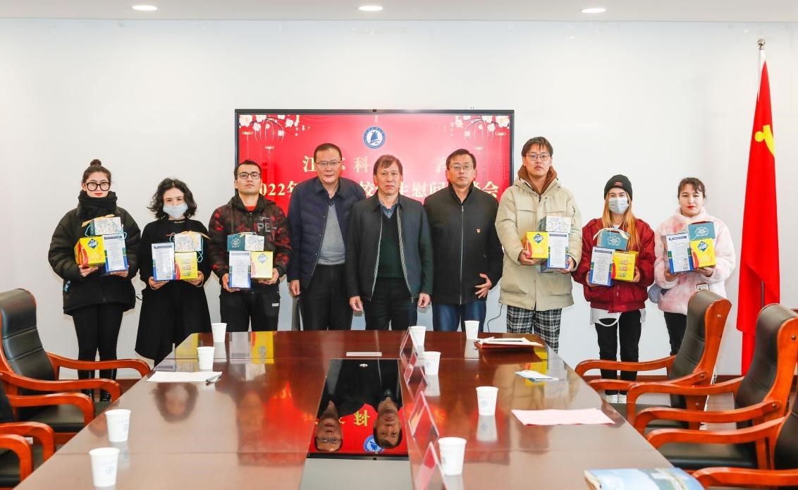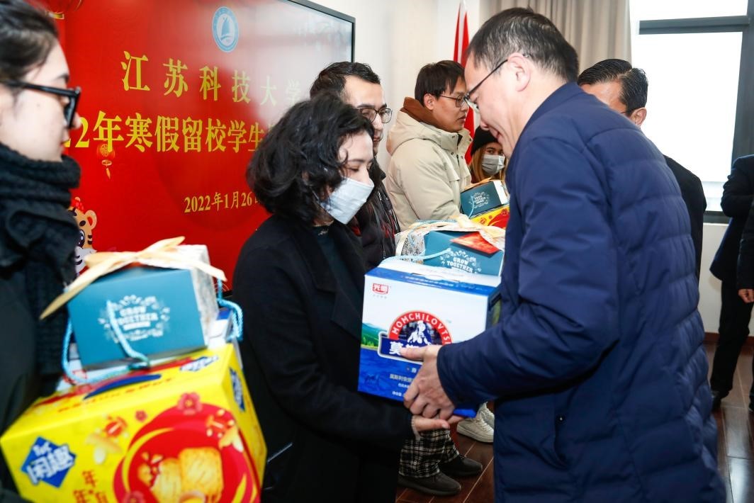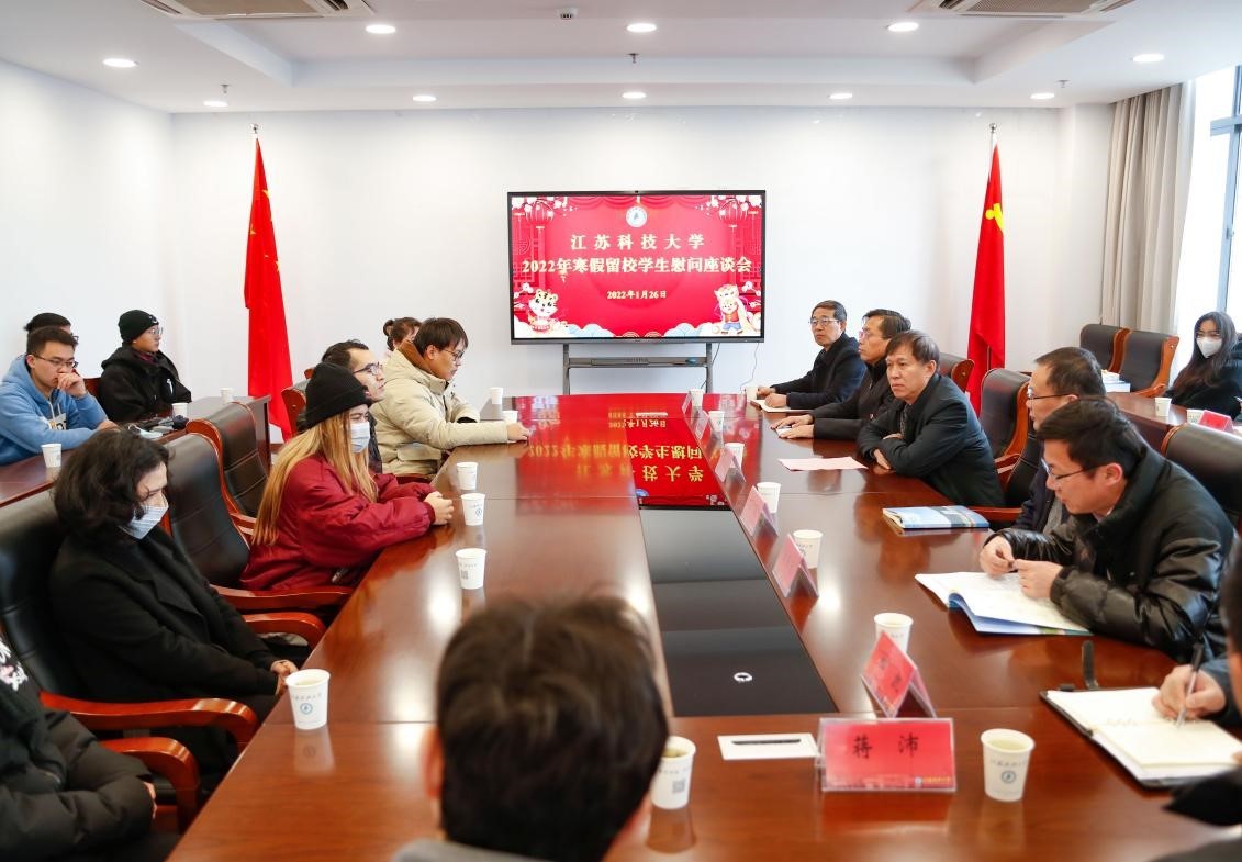爱心驱寒意,温情暖人心。隆冬岁末的室外严寒凛冽,必赢bwin官网入口行政楼8楼会议室里却洋溢着浓浓的暖意。1月26日上午,该校党委书记葛世伦,党委常委、副校长汤建,镇江市高校园区建设指挥部副总指挥马士良,高校投资集团副总经理蒋沛看望慰问留校学生,了解留校学生学习生活情况,有针对性地给予指导和帮助,并赠送慰问礼包。