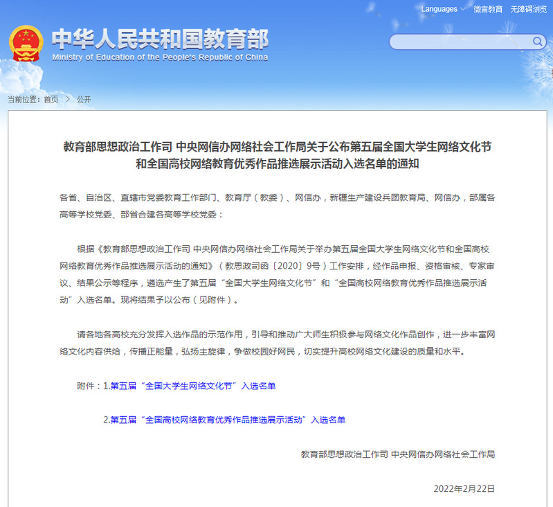 近日,中华人民共和国教育部下发了《教育部思想政治工作司、中央网信办网络社会工作局关于公布第五届全国大学生网络文化节和全国高校网络教育优秀作品推选展示活动入选名单的通知》。在校党委宣传部领导组织下,必赢官网马克思主义学院提交的网络作品《青藏铁路精神》获得优秀奖。