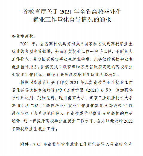 近日,江苏省教育厅印发《省教育厅关于2021年全省高校毕业生就业工作量化督导情况的通报》(苏教学函〔2022〕6号),必赢官网获评A等(第一等次)。