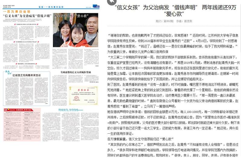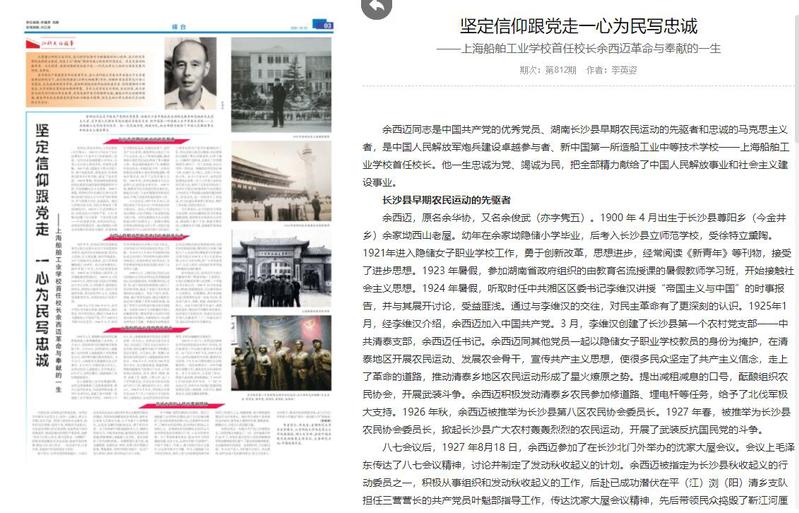 本届获得船舶新闻奖副刊类一等奖的江科大校报作品为《坚定信仰跟党走一心为民写忠诚——上海船舶工业学校首任校长余西迈革命与奉献的一生》(李英姿);文字类三等奖的作品为《朱大林:到祖国最需要的地方绽放青春》(万旻 谢凌燕)《“信义女孩”为父治病发借钱声明两年践诺还9万爱心款》(谢凌燕)。