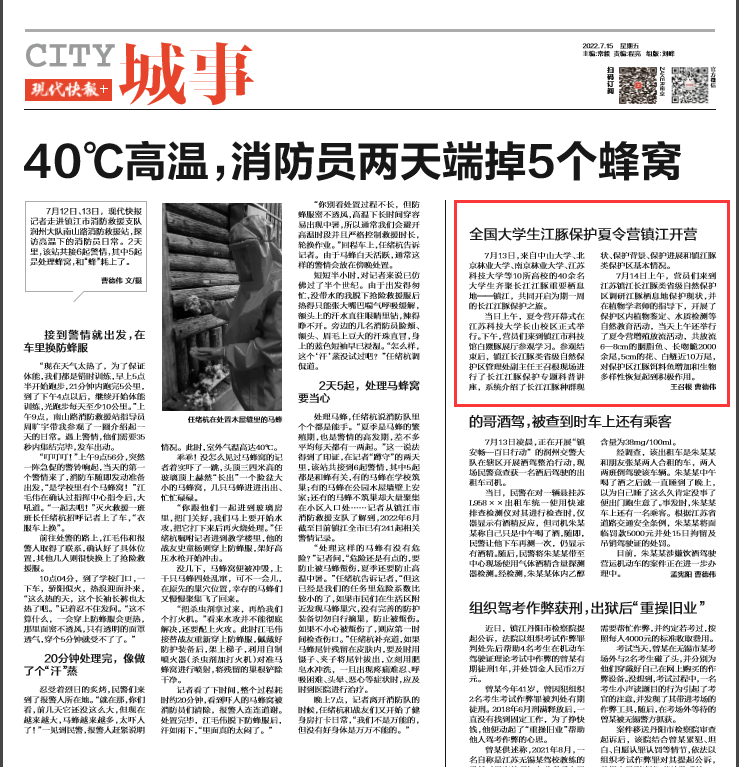 7月13日,来自中山大学、北京林业大学、南京林业大学、必赢bwin官网入口等10所高校的40余名大学生齐聚长江江豚重要栖息地——镇江,共同开启为期一周的长江江豚保护之旅。