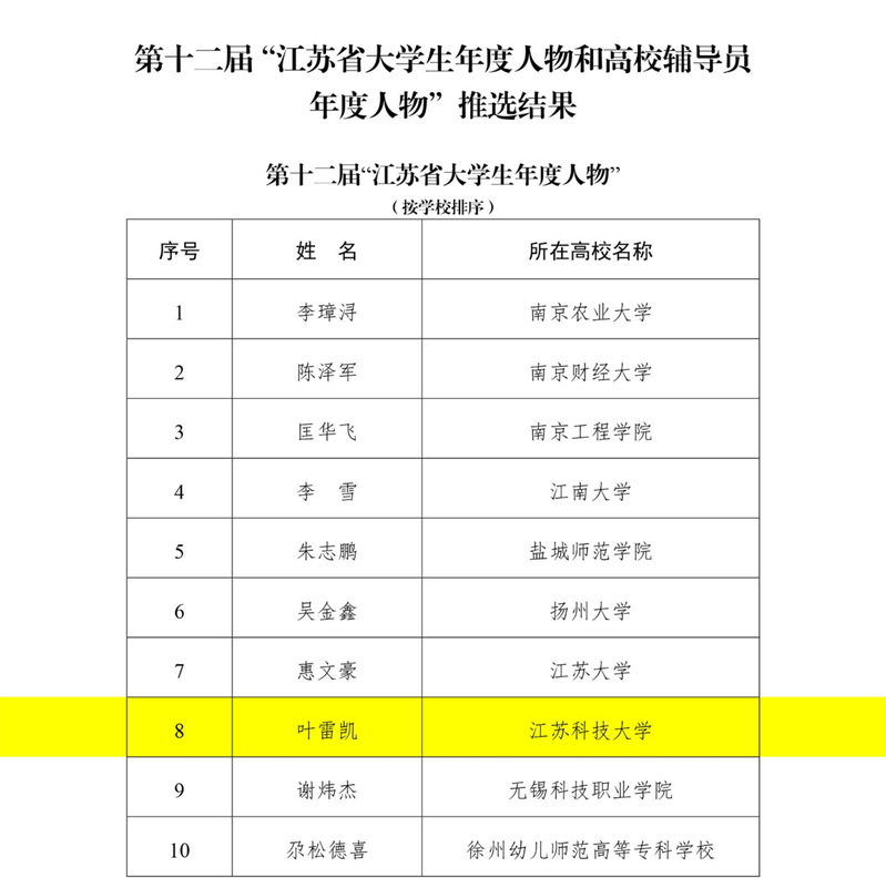 近日,江苏省委教育工委、省教育厅公布了第十二届“江苏省大学生年度人物和高校辅导员年度人物”暨2022年“最美大学生”“最美高校辅导员”推选结果,必赢官网环境与化学工程学院2021级硕士研究生叶雷凯荣获第十二届江苏省“大学生年度人物”。