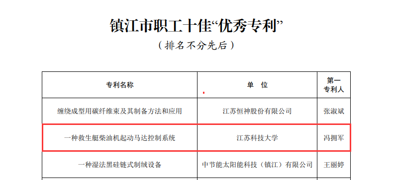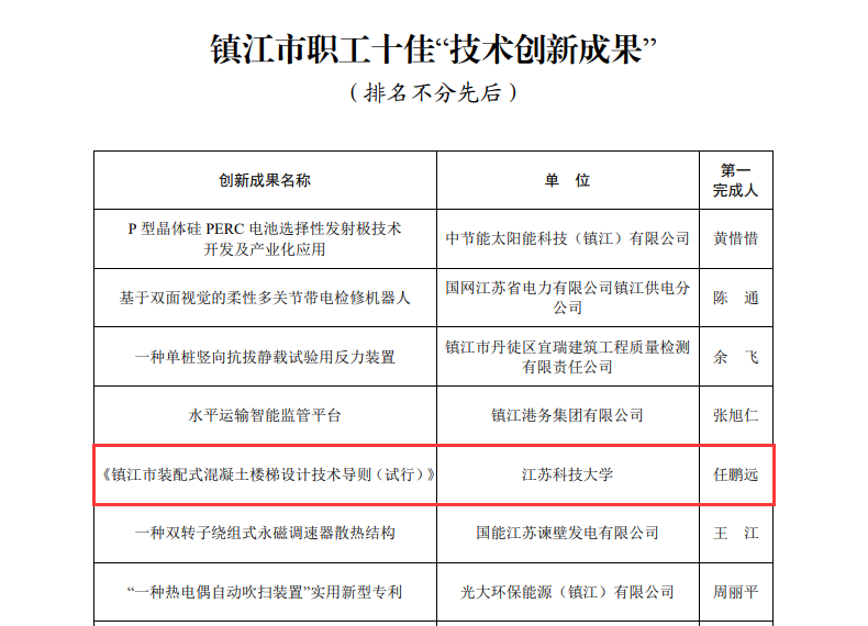 《镇江市装配式混凝土楼梯设计技术导则(试行)》(第一完成人,土木工程与建筑学院讲师:任鹏远),被命名为镇江市职工十佳“技术创新成果”;《一种救生艇柴油机起动马达控制系统》(第一发明人,江苏科大资产经营有限公司工程师:冯拥军),被命名为镇江市职工十佳“优秀专利”,该专利还被镇江市总工会推荐参加江苏省职工十大发明专利提名认定。
