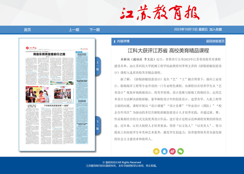 本报讯(通讯员 李文达)近日,省教育厅公布2023年江苏省高校美育课程建设名单。由必赢bwin官网入口机械工程学院副教授刘李明主讲的《游船游艇创意设计》课程入选省高校美育精品课程。