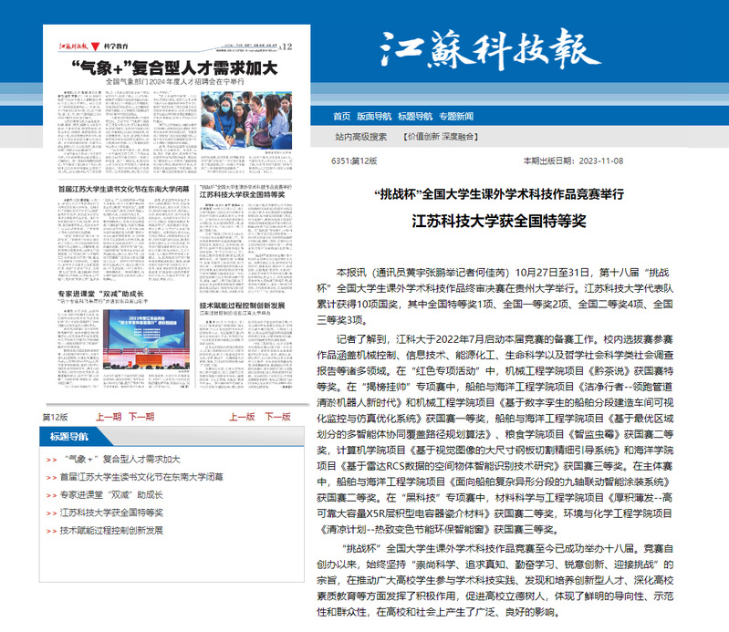 记者了解到,江科大于2022年7月启动本届竞赛的备赛工作。校内选拔赛参赛作品涵盖机械控制、信息技术、能源化工、生命科学以及哲学社会科学类社会调查报告等诸多领域。在“红色专项活动”中,机械工程学院项目《黔茶说》获国赛特等奖。在“揭榜挂帅”专项赛中,船舶与海洋工程学院项目《洁净行者--领跑管道清淤机器人新时代》和机械工程学院项目《基于数字孪生的船舶分段建造车间可视化监控与仿真优化系统》获国赛一等奖,船舶与海洋工程学院项目《基于最优区域划分的多智能体协同覆盖路径规划算法》、粮食学院项目《智监虫霉》获国赛二等奖,计算机学院项目《基于视觉图像的大尺寸钢板切割精细引导系统》和海洋学院项目《基于雷达RCS数据的空间物体智能识别技术研究》获国赛三等奖。在主体赛中,船舶与海洋工程学院项目《面向船舶复杂异形分段的九轴联动智能涂装系统》获国赛二等奖。在“黑科技”专项赛中,材料科学与工程学院项目《厚积薄发--高可靠大容量X5R层积型电容器瓷介材料》获国赛二等奖,环境与化学工程学院项目《清凉计划--热致变色节能环保智能窗》获国赛三等奖。