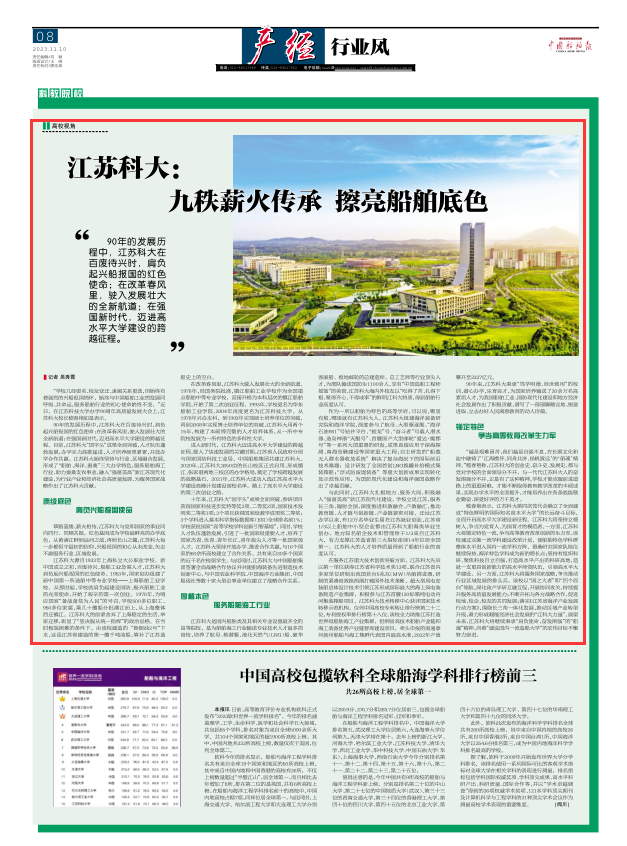 在服务江苏重大技术创新突破方面,江苏科大先后以第一单位获得江苏省科学技术奖13项,联合江苏省内多家单位研制出我国首台5兆瓦(MW)吊舱推进器,研制的紧凑高效换热器打破国外技术垄断,超大型风电安装船总体设计技术引领江苏形成国际最大的海上风电装备制造产业集群,积极参与江苏首艘120标箱纯电动内河集装箱船项目。江苏科大技术转移中心获评国家技术转移示范机构,位列中国高校专利转让排行榜第二十二位,专利授权率排行榜第十八位。该校全力助推江苏打造世界级船舶海工产业集群,担纲省高技术船舶产业链和海工装备优势产业链智库建设项目,牵头申报的南通泰州扬州船舶与海工集群代表国内最高水准,2022年产值攀升至2327亿元。90年来,江苏科大秉承“笃学明德、经世致用”的校训,潜心办学,乐育良才,为国家培养输送了20余万名高素质人才,为我国船舶工业、国防现代化建设和地方经济社会发展作出了积极贡献,谱写了一部部脚踏实地、锐意进取、立志办好人民满意教育的动人诗篇。