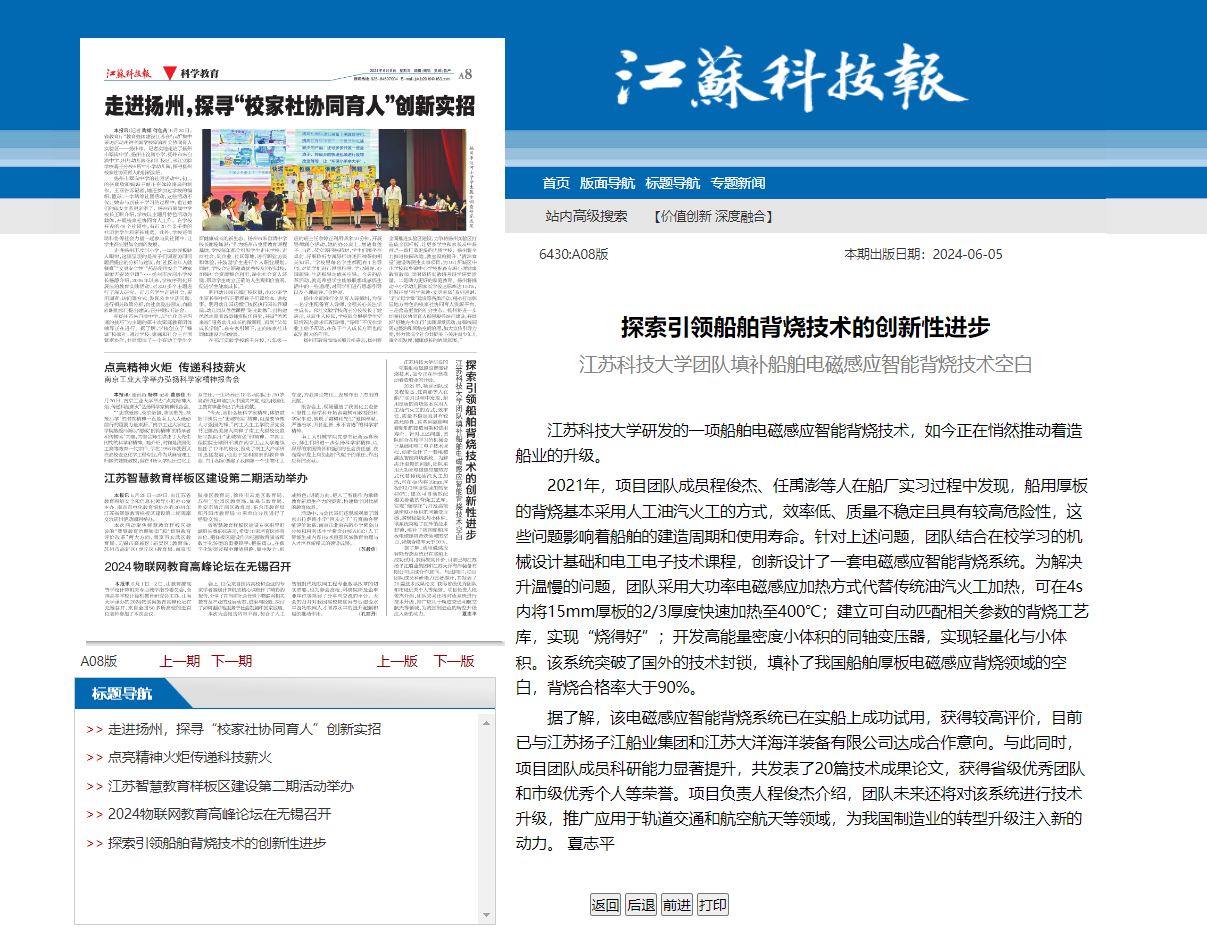 据了解,该电磁感应智能背烧系统已在实船上成功试用,获得较高评价,目前已与江苏扬子江船业集团和江苏大洋海洋装备有限公司达成合作意向。与此同时,项目团队成员科研能力显著提升,共发表了20篇技术成果论文,获得省级优秀团队和市级优秀个人等荣誉。项目负责人程俊杰介绍,团队未来还将对该系统进行技术升级,推广应用于轨道交通和航空航天等领域,为我国制造业的转型升级注入新的动力。 夏志平