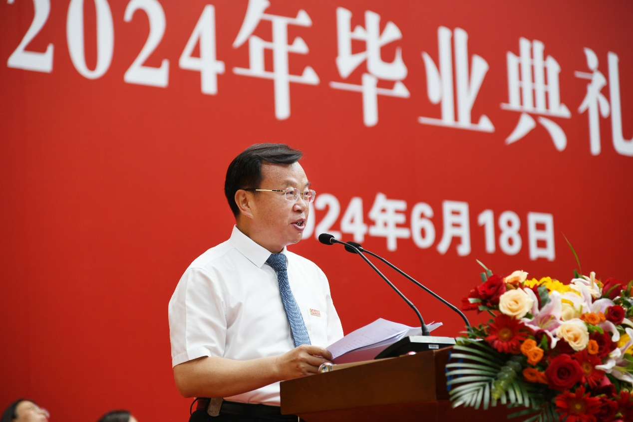 “大家将青春留在母校的锦绣年华里,母校也因你们而活力四射。”周南平回顾同学们与学校共同见证的高光时刻:中国共产党成立100周年的辉煌和党的二十大胜利召开,办学90周年盛典,学校入选江苏高水平大学建设高校,实现国家级教学成果奖、作为第一单位发出首篇NATURE论文等历史性突破。新增2个学科进入ESI全球排名前1%,新增1个一级学科博士点、2个一级学科博士后科研流动站,获批国家级一流本科专业21个,引进培育海外院士、国家杰青等一大批国家级人才。周南平希望同学们从这段与江科大共生共长的生命岁月中汲取力量,用热辣滚烫的青春追求爱与幸福,奔赴山海。