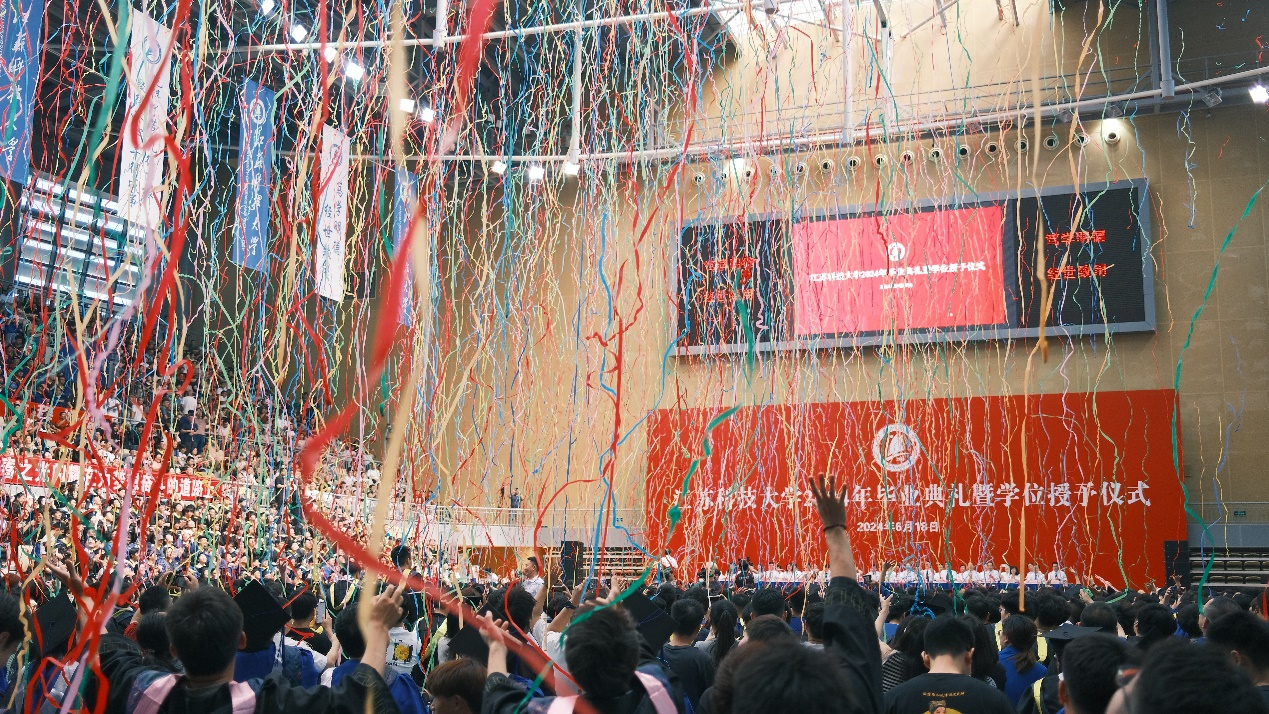 在祝福中,万千彩带从天而降,将这闪耀的时刻装点得更加缤纷绚烂。导师们身着导师服上台站定,庄重的学位授予仪式正式开始。毕业生身穿学位服,依次上台领取学位证书,学位委员会全体导师为他们拨穗正冠、颁发学位证书并合影留念,学位授予仪式圆满完成。莹莹玉壶心,依依惜别情。台下,毕业生们与挚友相携、与父母相拥,合影留念,用相机定格美好的瞬间。
