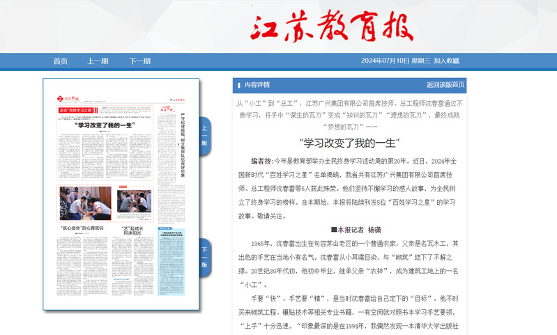 编者按:今年是教育部举办全民终身学习活动周的第20年。近日,2024年全国新时代“百姓学习之星”名单揭晓,我省共有江苏广兴集团有限公司首席技师、总工程师沈春雷等5人获此殊荣。他们坚持不懈学习的感人故事,为全民树立了终身学习的榜样。自本期始,本报将陆续刊发5位“百姓学习之星”的学习故事。敬请关注。